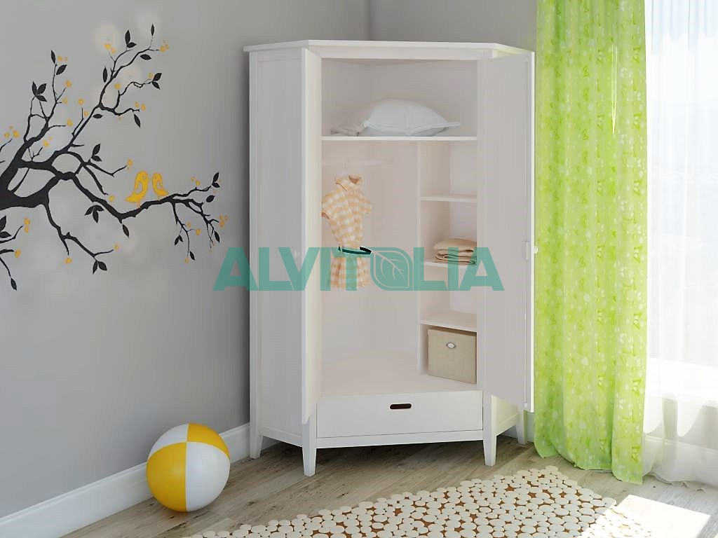 - Внутри шкафа Шкаф имеет следующее наполнение: отделение со штангой и отделение с полками. Внизу шкафа - один выдвижной ящик на роликовых направляющих.