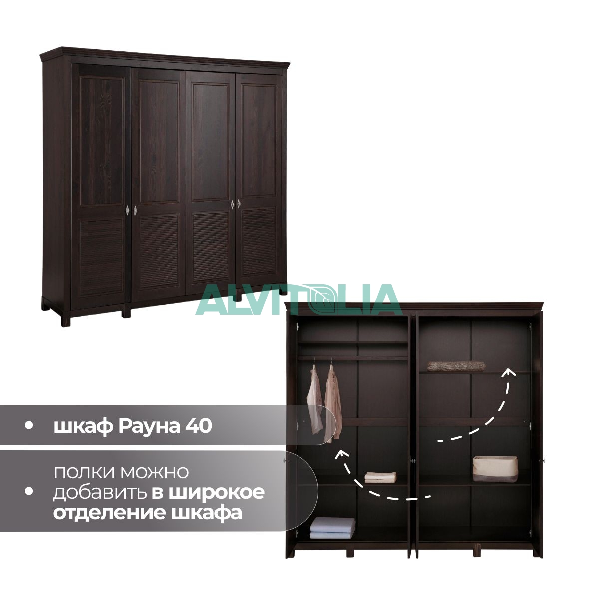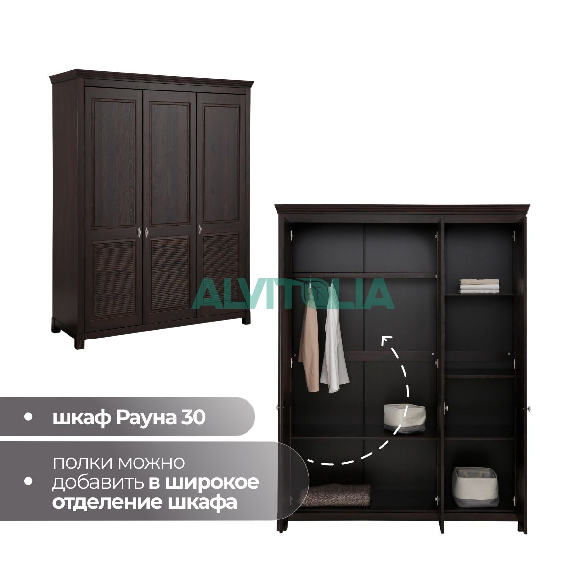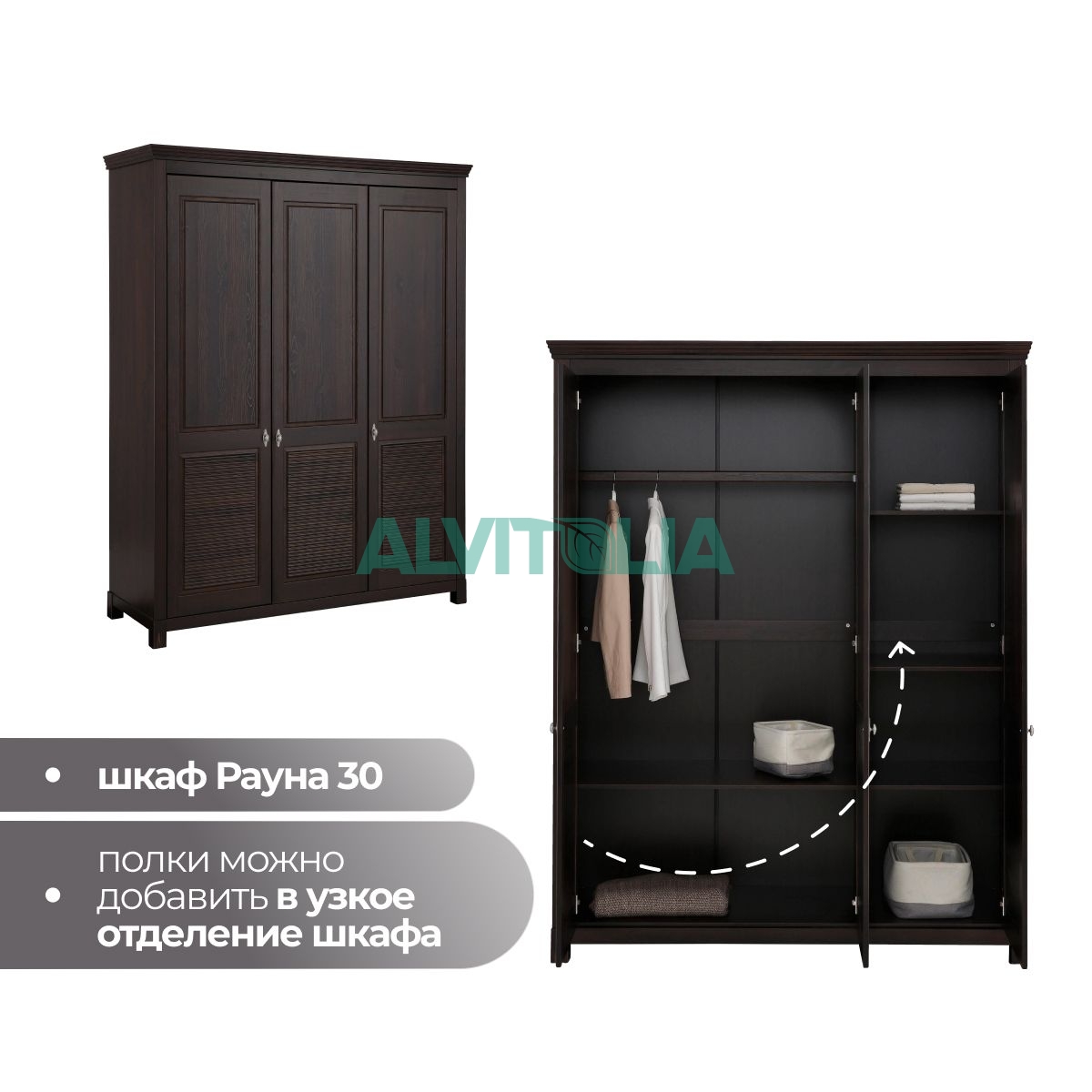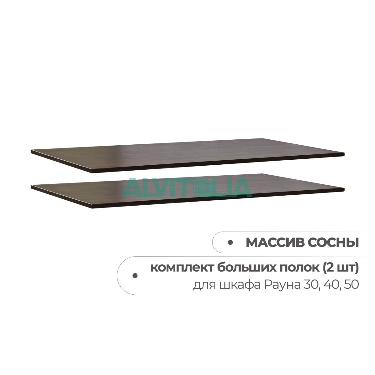 Дополнительные полки в шкаф для одежды Рауна. Комплект малых полок (размер 531х545х15мм) подходит для шкафов для Рауна 20 / 30, а комплект больших полок (размер 1034х545х15мм) - для шкафов Рауна 30 / 40 / 50.