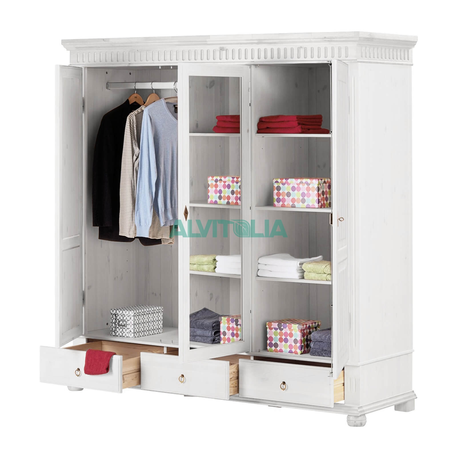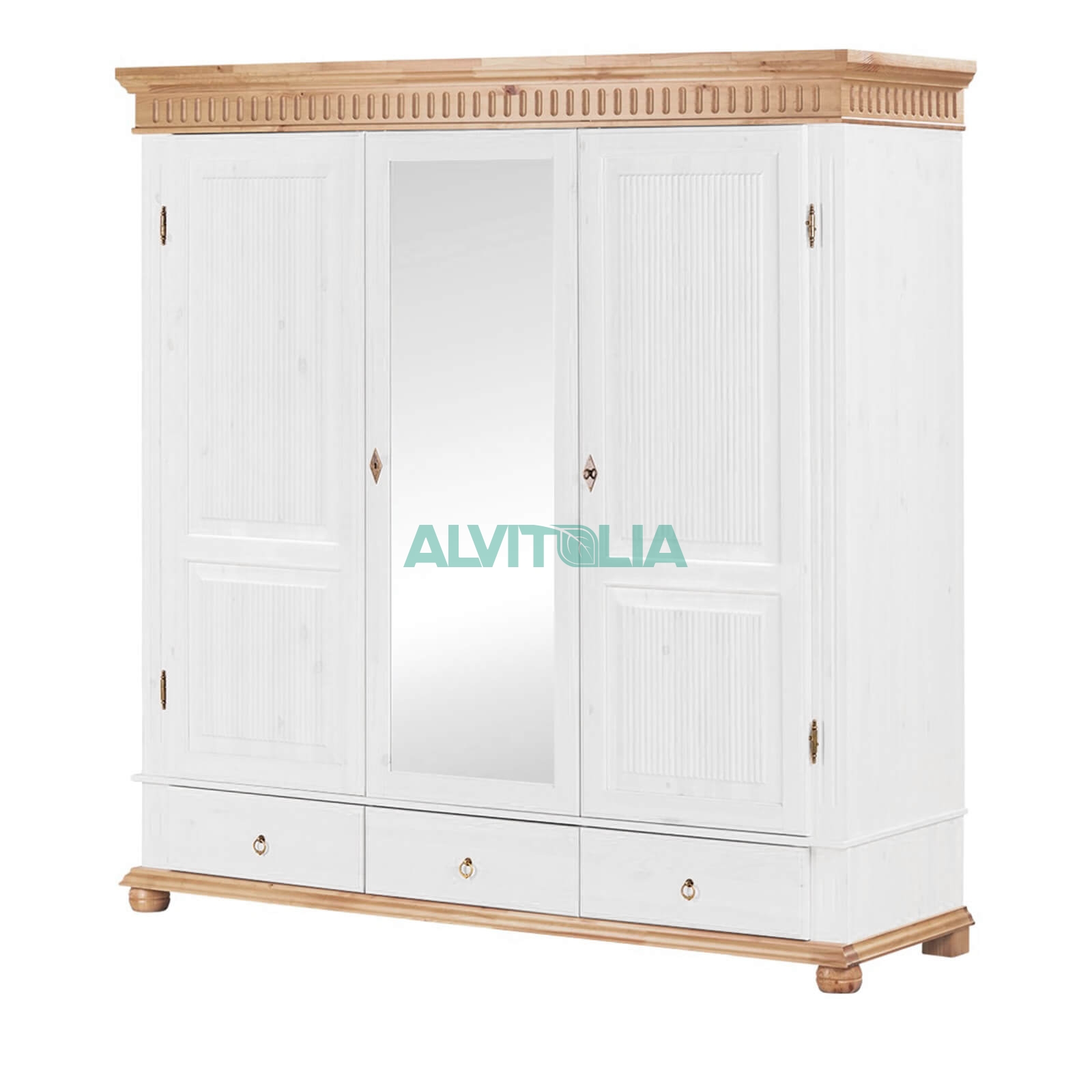 Вместительный трёхдверный шкаф Хельсинки с зеркалом из массива сосны. Внутри шкафа: шляпная полка и 1 штанга с левой стороны, 4 полки по правой стороне, 3 выдвижных ящика на шариковых направляющих внизу.