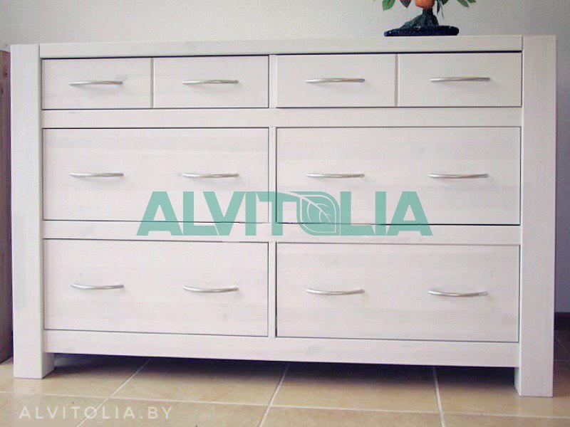 Комод Фьорд 24 - самый популярный выбор для спальни: 2 ящика сверху для вещей поменьше (на шариковых направляющих) и 4 вместительных ящика для крупных вещей (на роликовых направляющих). Обратите внимание, что на фасадах верхних ящиков имитация "двойного" ящика.