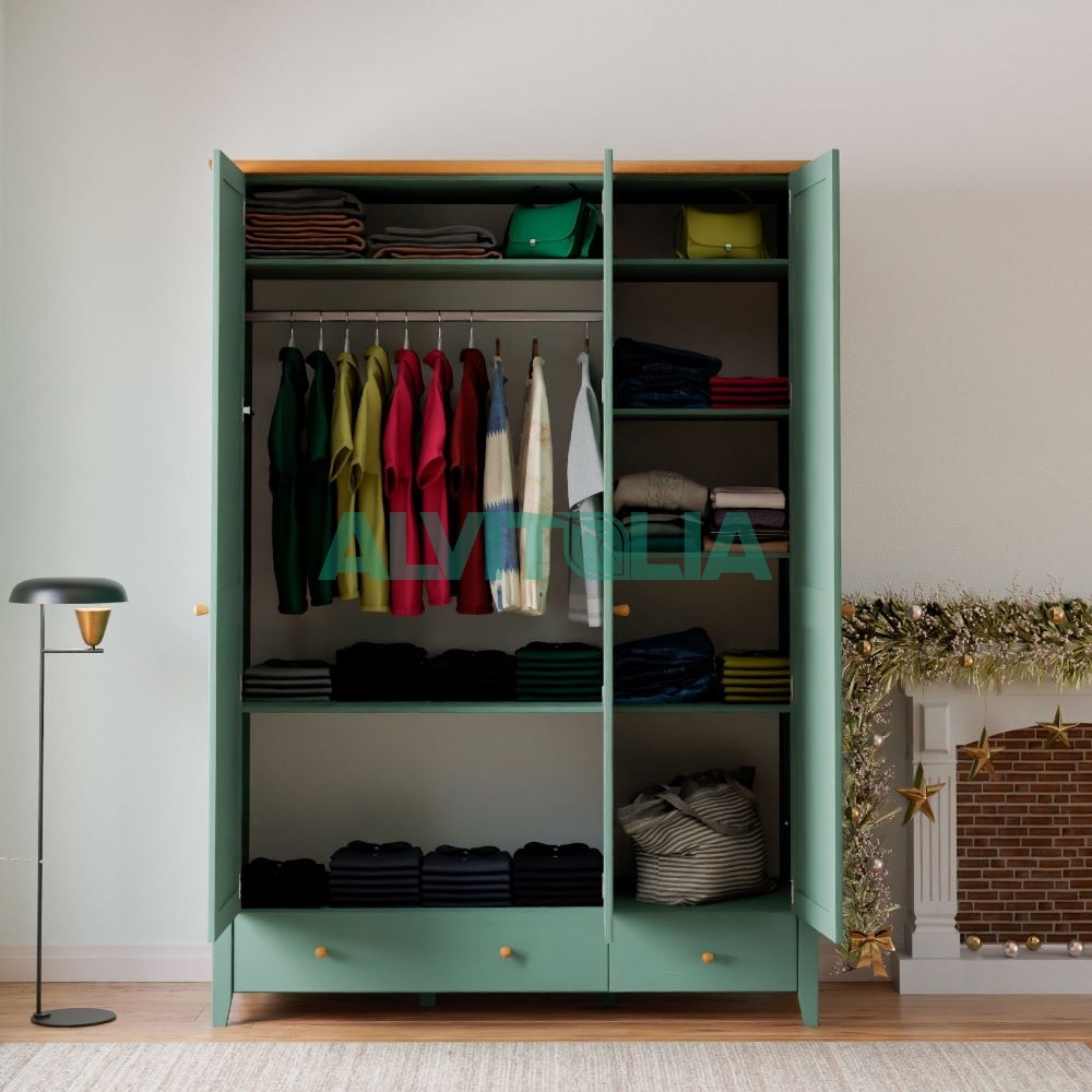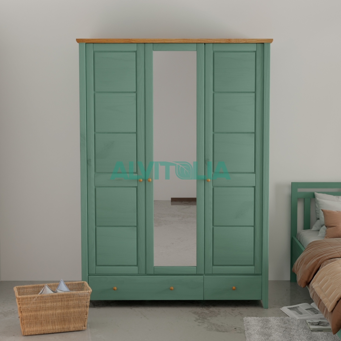 Вместительный распашной шкаф для одежды из массива сосны. Выполненный в стиле прованс, этот шкаф укомплектован штангой для одежды, двумя ящиками для мелочей и множеством полок для удобной огранизации ваших вещей. Высокое зеркало на центральной дверце - практичное решение для помещений с небольшой площадью.